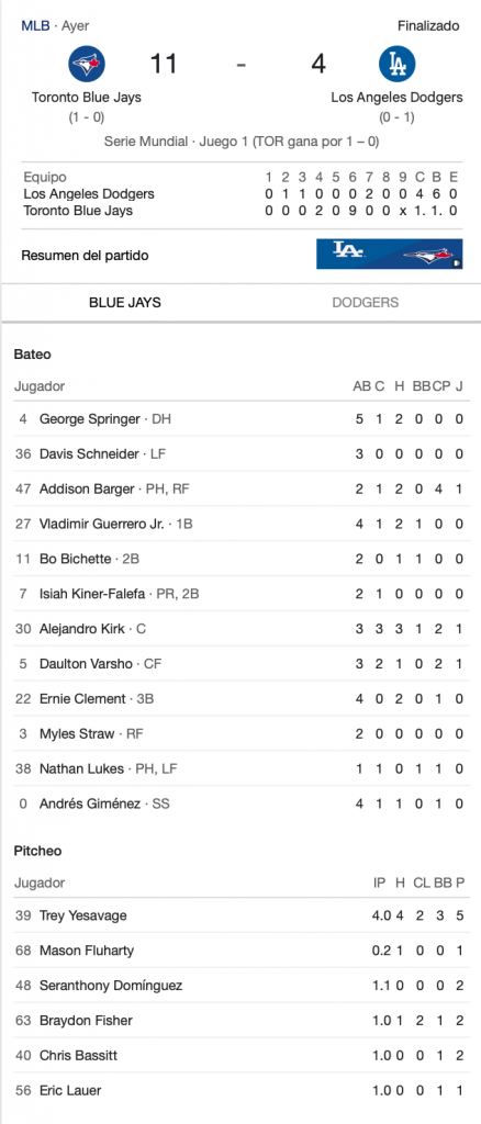 El marcador final de 11-4 fue más que un resultado. Fue una declaración. Toronto no solo puso la serie 1-0. Alteró la narrativa completa de esta final. Los Dodgers, considerados favoritos antes de lanzar la primera pelota, quedaron bajo la presión inmediata de evitar un 0-2 que históricamente condena a cualquier aspirante.