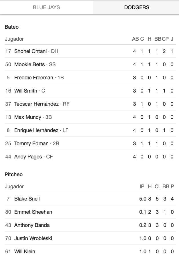 Los primeros innings fueron un juego de tensión contenida. Los Dodgers golpearon primero, aprovechando el tráfico en bases generado por Yesavage, quien acumuló pitcheos desde temprano pero controló el daño. Los Ángeles tomó ventaja 2-0 y el ambiente pareció inclinarse hacia el guion esperado. Sin embargo, Snell no lograba establecer dominio real. Toronto extendía turnos, elevaba su conteo de lanzamientos y le obligaba a trabajar desde atrás en la cuenta.