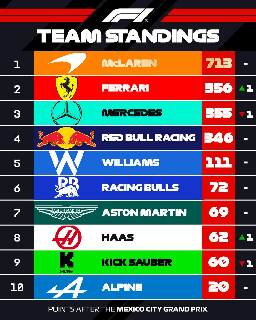 La lucha de constructores se convirtió en guerra de desgaste. Mercedes y Ferrari siguen batallando por el segundo puesto, mientras Red Bull acecha desde atrás. México reordenó el tablero emocional del paddock.